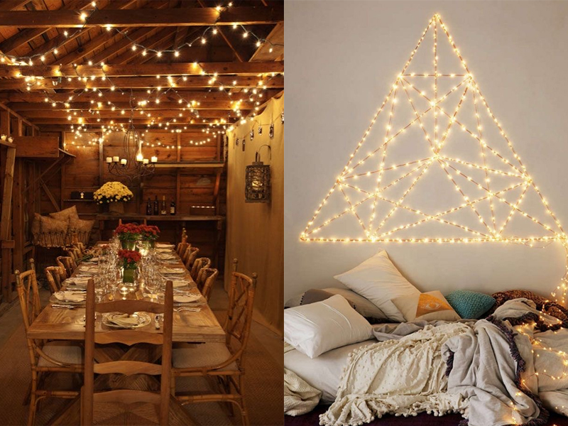 The beauty of string lights is that you can shape them into anything your heart desires. You can do an abstract shape or make a picture. This picture can be something specific you have in mind, or something that fits the overall theme of your room. This wall art also doubles as a night light. Draw the shape and strategically place nails to wrap the wire around and form whatever shape you’d like.
