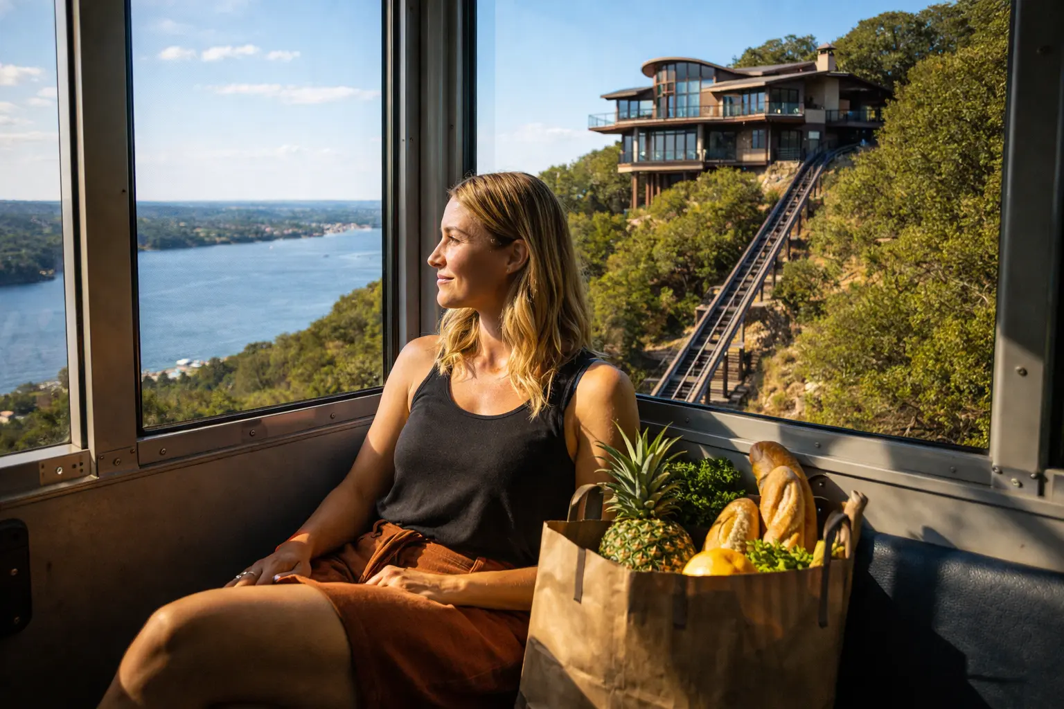 For most people, the trip from their car to the front door takes a few seconds. Here, it is part of the charm. The tram ride itself takes around three minutes to reach the main stop, which means every arrival comes with a built-in pause between the outside world and home life. Instead of rushing in with your keys still in hand and your brain still stuck on errands, traffic, or work, you get a few quiet minutes suspended above the hillside. It is the kind of detail that sounds impractical at first, but the more you picture it, the more it starts to feel like a luxury.