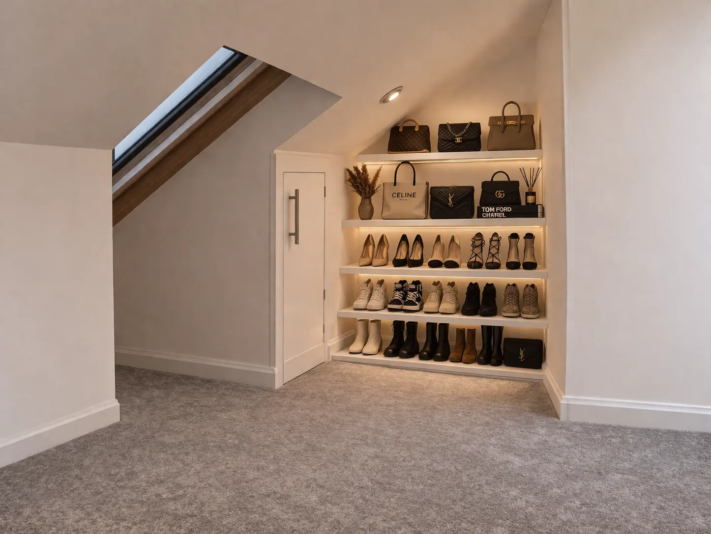 And that’s when it clicked. Shoes. Bags. Accessories. Not just stored away, but displayed. With the addition of soft lighting and clean shelving, the nook could transform into something that looked almost custom-built — like a boutique-style feature right inside the home.