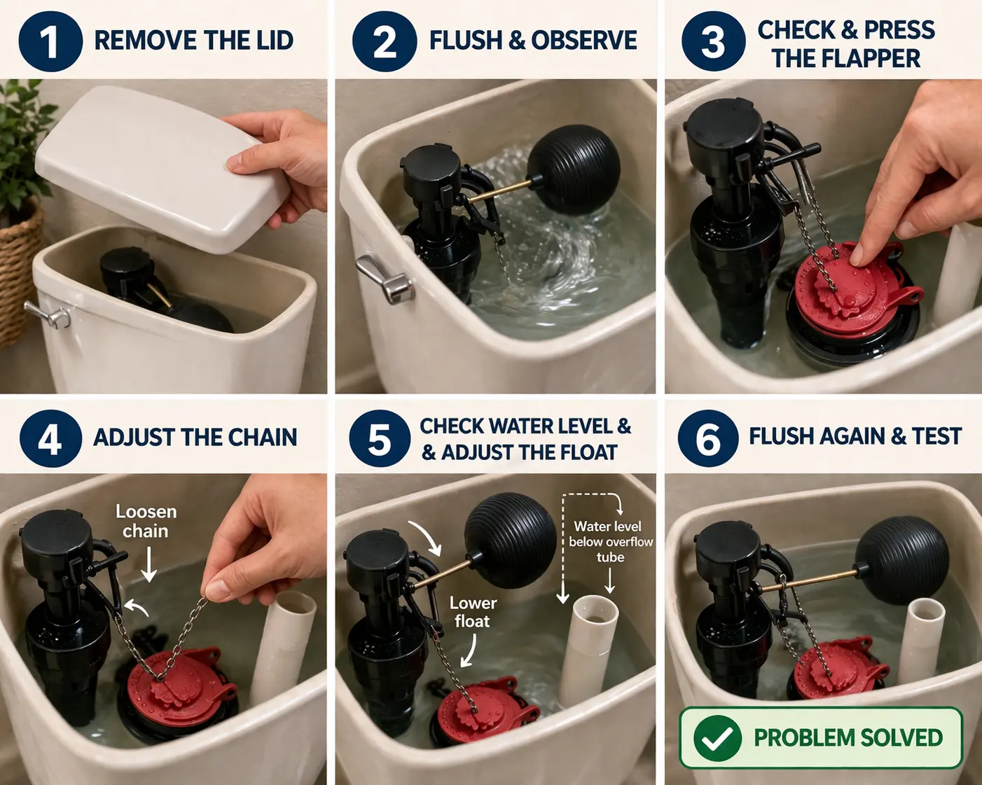 Start by taking the lid off the toilet tank and setting it somewhere safe. Then flush the toilet once and watch what happens inside as the tank refills. You’re looking for anything that doesn’t seem to reset properly after the flush is done. If the flapper at the bottom doesn’t close fully, press it gently into place. Sometimes it just isn’t sealing properly. If the chain looks too tight, twisted, or caught on something, loosen it so the flapper can drop naturally without being pulled upward.