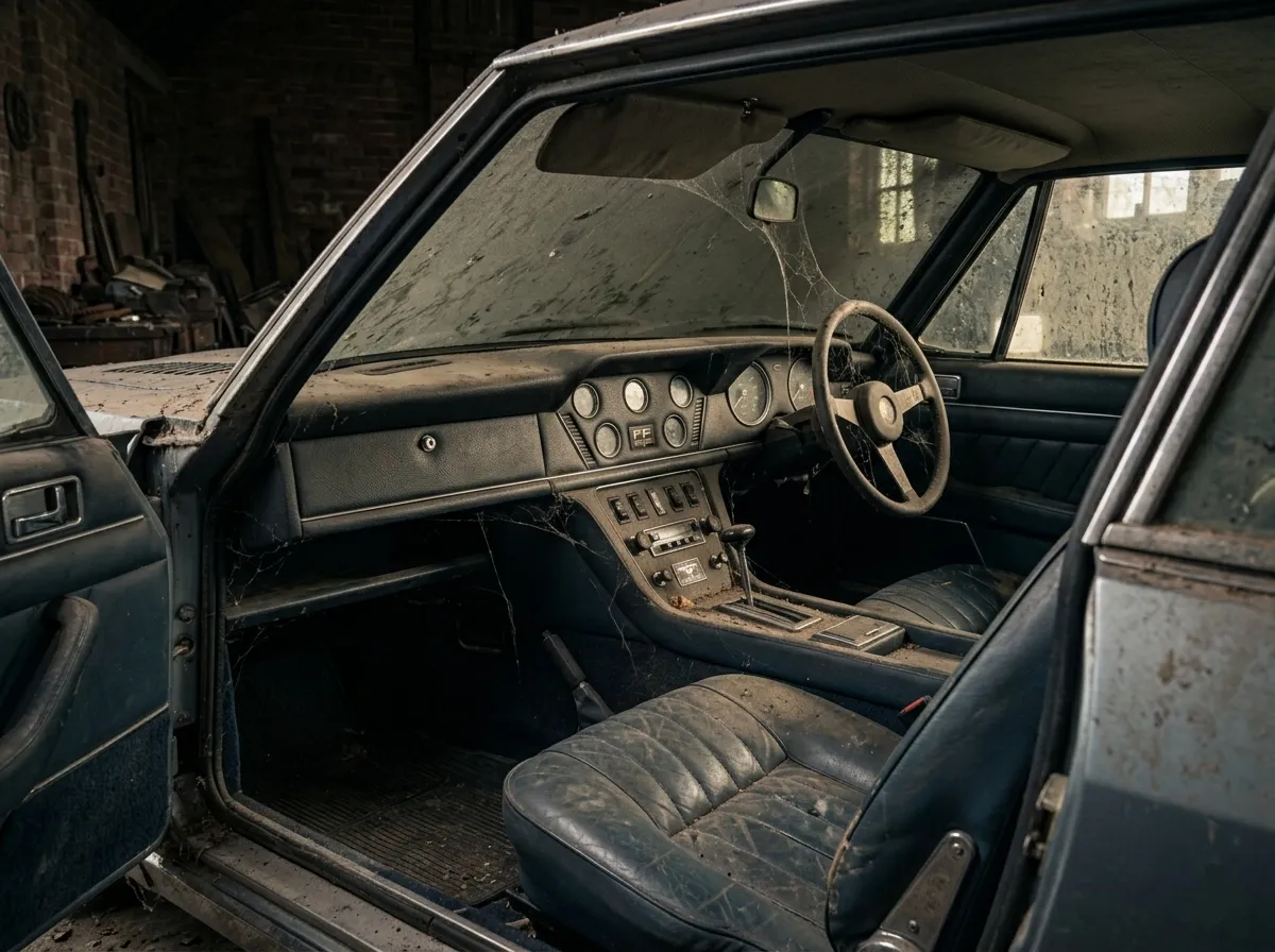 That is exactly what makes this barn find so compelling. It has survived in the condition its owner effectively left it in, with its story still attached. The Mist Grey paint might have been covered in dust and cobwebs, but beneath that layer was the original finish rather than a modern redo. The interior was well-preserved and authentic, which is rare enough on its own. Even more impressive was the paperwork that stayed with the car. The original keys were still there. So were the green registration logbook, service invoices, historical records, and even the original purchase receipt. For collectors, historians, and enthusiasts, that kind of documented continuity is almost as valuable as the machine itself.