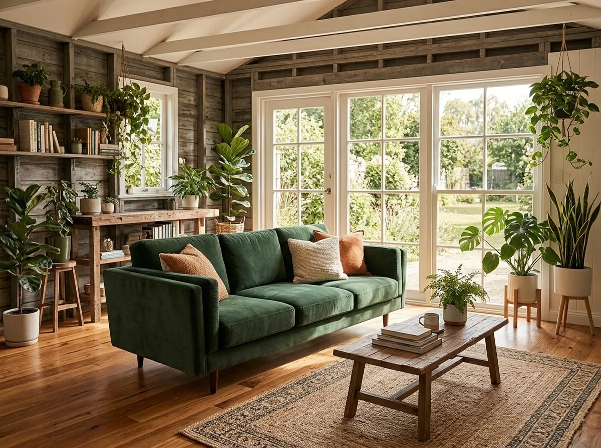 The centerpiece of the living area is a plush, forest-green velvet sofa that looks as though it was made for afternoon naps. Across from it, a rustic coffee table made from reclaimed timber sits atop a thick, Moroccan-style rug. Large windows were cut into the side walls to flood the room with natural light, a crucial design choice that prevents the garage from feeling “boxy.” Potted ferns and trailing ivy hang from the ceiling, bringing a sense of life and oxygen into the sanctuary.