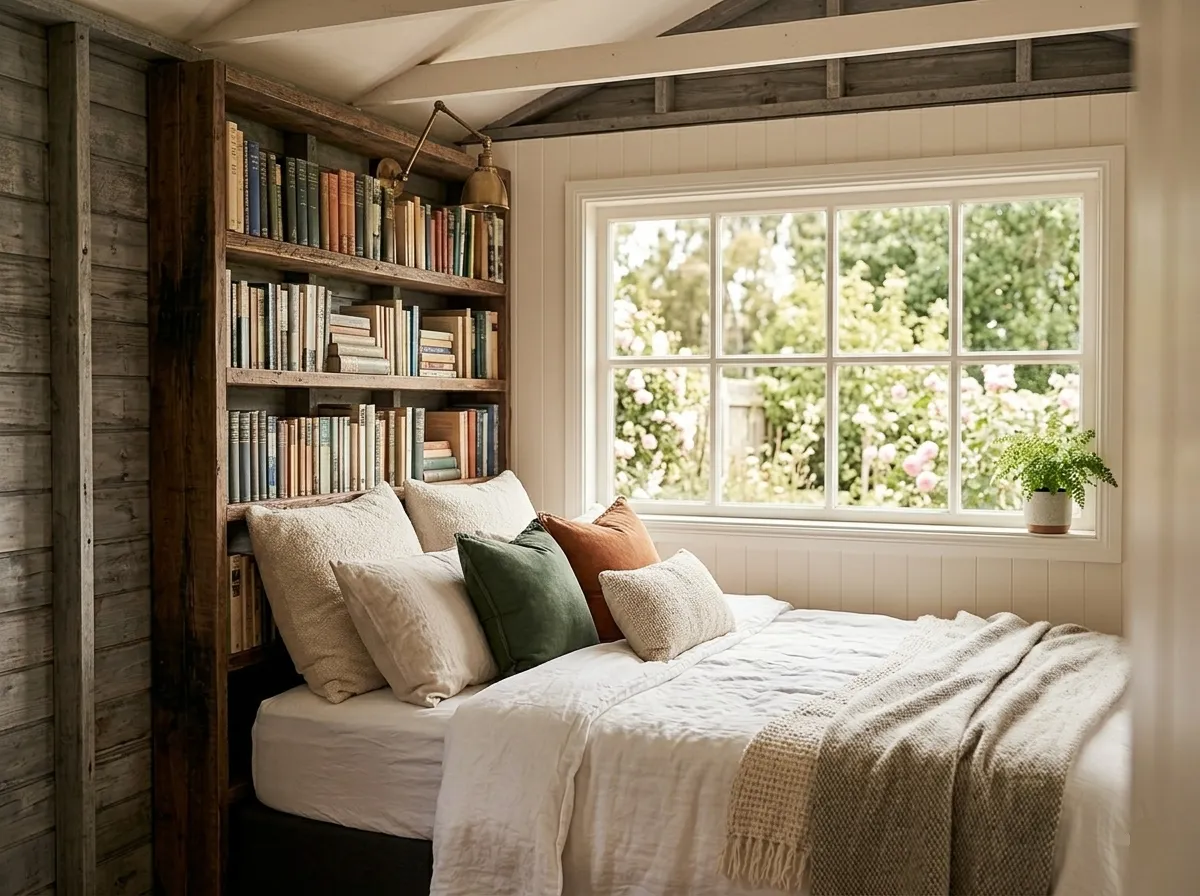 Tucked neatly beside the bed is a floor-to-ceiling bookshelf, packed with novels, travel guides, and a vintage brass lamp for late-night reading. This corner of the garage is noticeably quieter, thanks to the extra insulation Chloe added to the walls. It’s a space designed for decompression. “When I’m back here, I completely forget I’m in a garage,” she says. “It feels like a hidden cabin in the woods, even though the main house is only thirty feet away.”