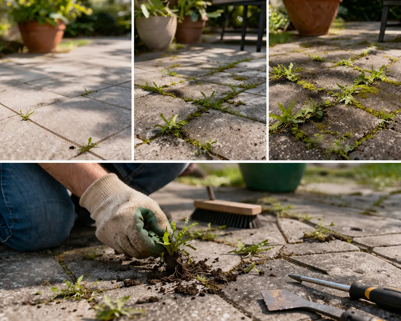 And this is usually where the job gets miserable. Most people go straight to the hardest part first — yanking the weeds out dry. That’s what turns a small cleanup into a frustrating chore. The roots snap. The stems break. Half the weed stays wedged in the gap. Then out comes the screwdriver, the scraper, or the long session of crouching over the tiles trying to dig everything out by hand. It’s not just tiring. It also makes the whole job feel way more stubborn than it actually is.