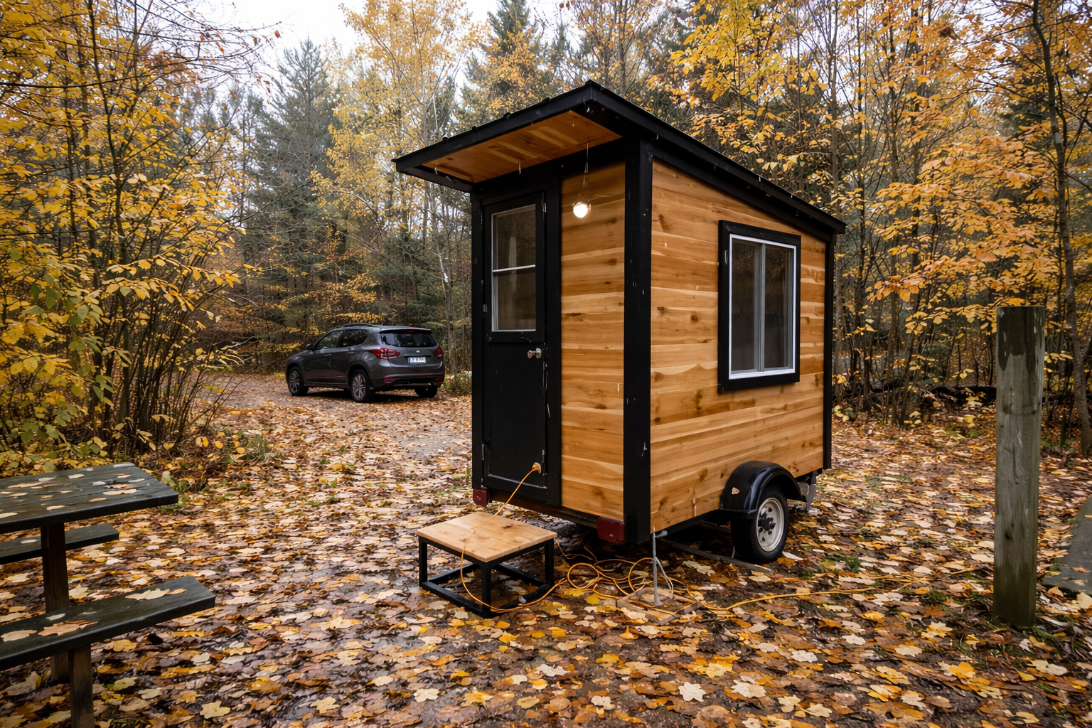 This tiny house in Minnesota takes compact living to a whole new level. Built on a small 4-by-8-foot Harbor Freight trailer, it measures just 32 square feet, yet it still manages to look polished and thoughtfully finished. The exterior pairs warm cedar cladding with black trim, giving it a clean, modern appearance that feels far more upscale than its modest size might suggest. It may be tiny enough to stop people in their tracks, but that is exactly what makes it so impressive. Every detail has been considered.