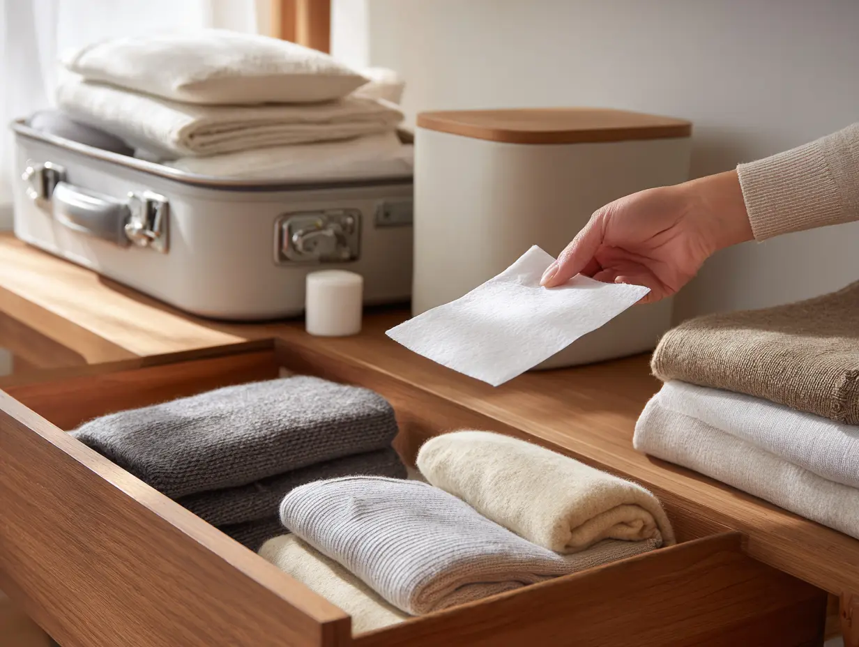 Dryer sheets can also be surprisingly useful in places where things sit for a while. Closets, drawers, storage bins, luggage, seasonal clothing containers, and shelves full of towels or bedding can all develop that slightly stale “stored away” smell over time — especially if they stay closed for long stretches without much airflow. That’s where a used dryer sheet can still do a little work.