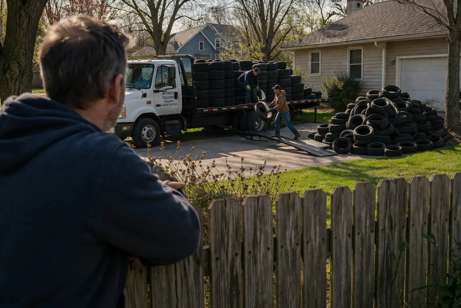 The thing Mark couldn’t shake was how quickly it escalated. At first, it was just enough to look odd from over the fence. Then it became enough to make him pause whenever he stepped into the backyard. Then one afternoon, he watched a flatbed truck pull up outside Darren’s house and unload what looked like an entire tractor’s worth of old tires into the driveway.