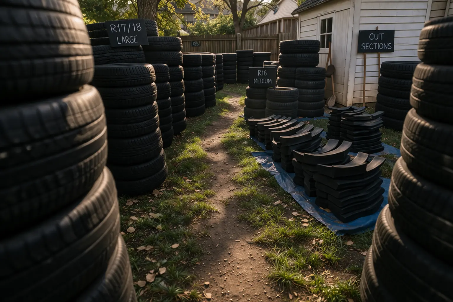 That was the first thing that threw Mark off. The tires weren’t just piled up randomly. Some had been grouped by size. Others were stacked more carefully than he’d expected. A few had clearly been cut apart. There were thick curved pieces of rubber laid out beside the shed and neatly trimmed sections stacked in small piles that clearly hadn’t been made by accident. This wasn’t hoarding. It wasn’t junk. And it definitely wasn’t random.