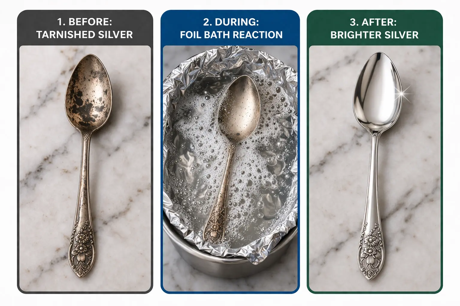 This is the part that makes the method so satisfying. Instead of manually polishing tarnish off the surface, the aluminum foil bath helps trigger a reaction that moves the tarnish away from the silverware. Tarnish on silver is typically silver sulfide, and in this setup, the aluminum acts as the more reactive metal in the solution.