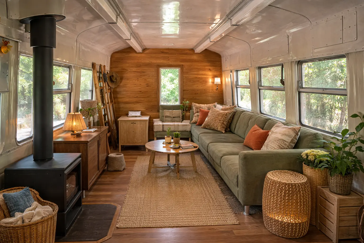 If the bedroom is the quietest part of Mila’s home, the lounge is the most inviting. She knew this section had to do a lot of work. It needed to feel comfortable enough for long evenings, stylish enough to match the rest of the carriage, and relaxed enough that visitors wouldn’t feel like they were sitting in a gimmick. So she built the room around comfort first. A deep sofa runs along one side, piled with textured cushions and soft blankets. Across from it, a compact shelf holds books, plants, and a small television, though Mila says the view outside usually wins. One of her favorite details is the little stove-style heater that gives the room its anchor. It instantly changes the mood, making the space feel less like a converted object and more like a proper home.