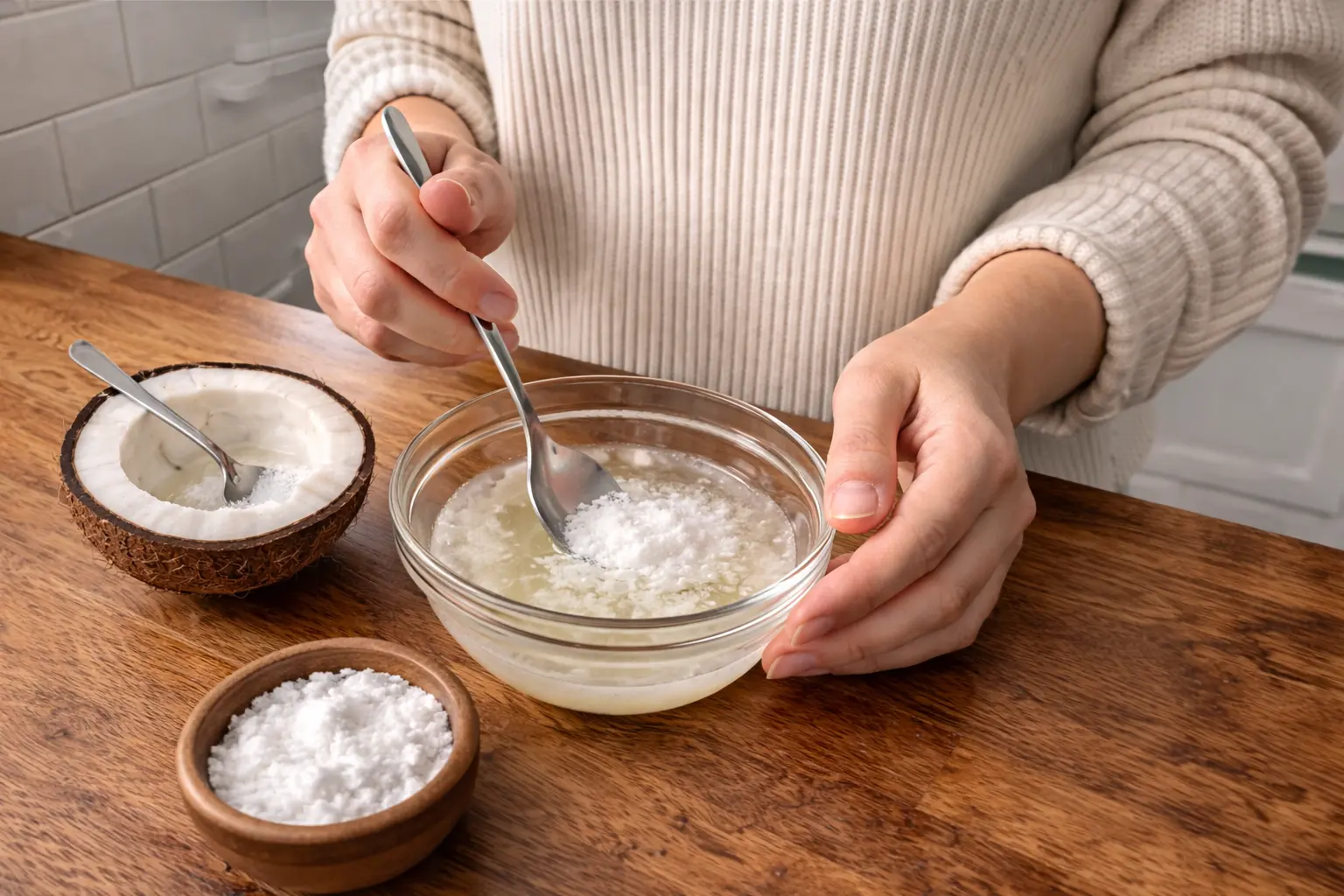 To make it, use 1 tablespoon of camphor and ½ cup of coconut oil. Crush the camphor into a fine powder, then stir it into warm — not boiling — coconut oil until it dissolves. Once it cools, massage a small amount into the affected area. This is a very simple recipe, but it can feel surprisingly effective for everyday body aches, especially after long workdays, cold weather, or periods of inactivity. The coconut oil helps soften the strength of the camphor while making it easier to spread across the skin. One thing to be careful about here is concentration.