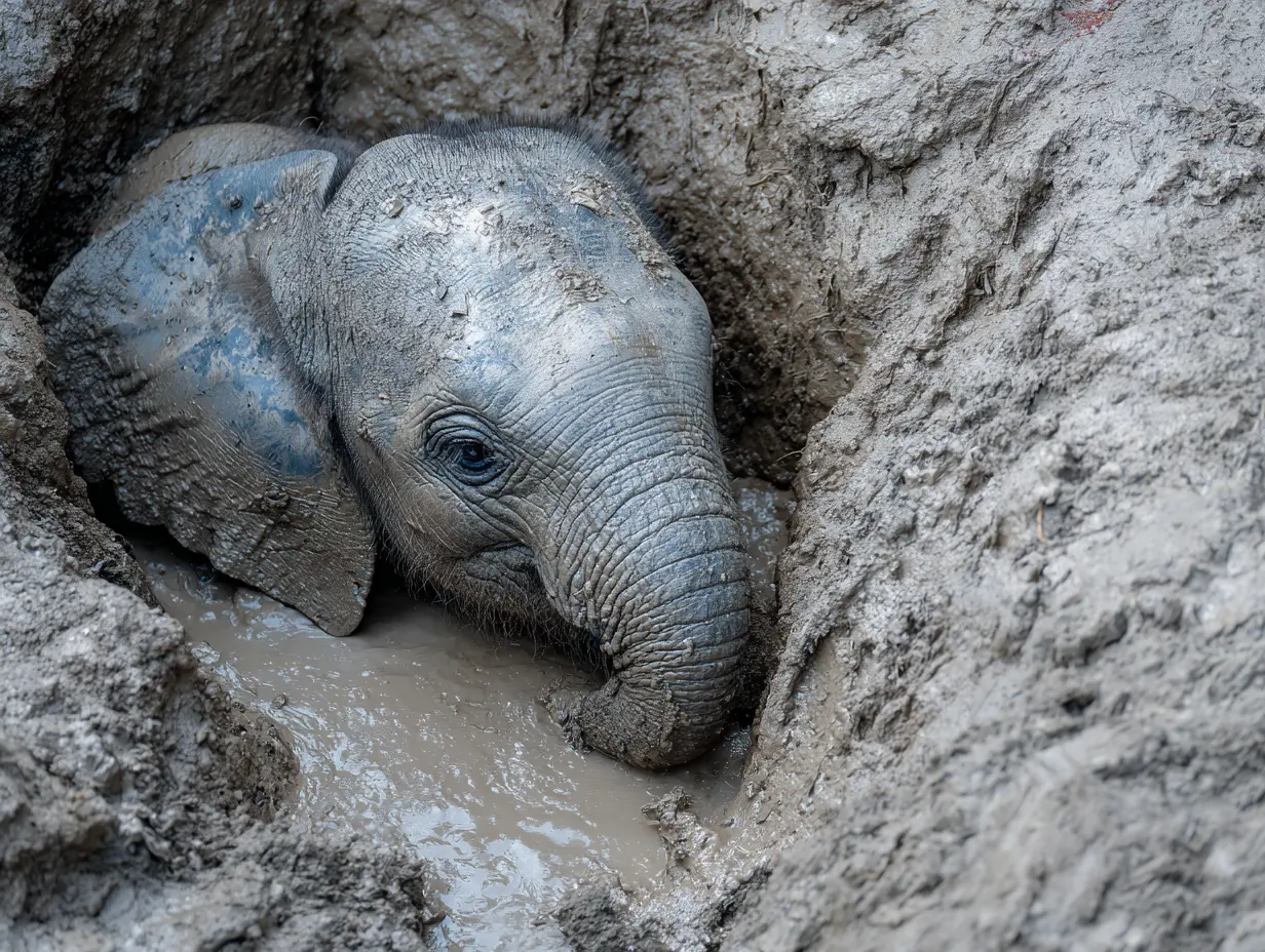 At first it was just mud. Dark. Thick. Shifting. Then something moved. Barely. Rahul leaned in. Focused. And then he saw it. A calf. Half-submerged. Its body coated in mud. Its trunk barely above the surface, struggling and weak. Every movement making it sink deeper into the mud. A gasp spread through the group. “That’s why…” someone whispered. Everything made sense. The digging. The noise. The urgency.