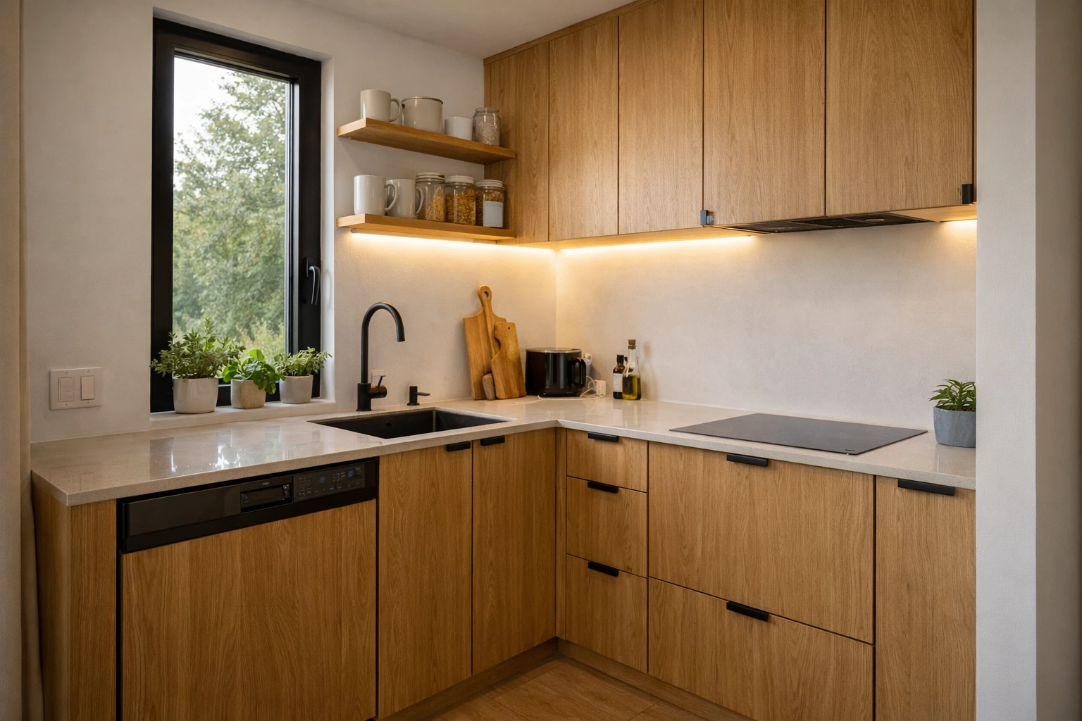 The kitchen sits along one side like a sleek ribbon of oak and matte black finish. Every shelf has a purpose, every drawer has been measured to fit exactly what she needs. Open shelving holds ceramic mugs, glass jars, and a few herbs in little pots by the window. Under-counter appliances keep the lines clean, while a narrow induction cooktop and a deep sink make the space fully functional without feeling crowded. Ava says that living small changed the way she cooks. She buys less, wastes less, and pays more attention to the things she uses every day.