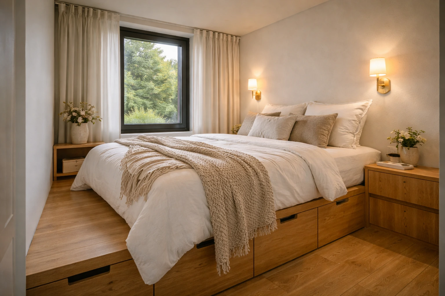 Further inside, Ava carved out the spaces that matter most when a house is also your retreat. The bedroom sits at the quieter end of the container, separated just enough from the main living space to feel private without making the home feel chopped up. She built the bed onto a raised platform with drawers hidden underneath, turning what could have been dead space into serious storage. Crisp white bedding, a textured throw, and a slim wall sconce give the room a hotel-like calm, while one carefully placed window frames a view of the trees outside. In the morning, that window is the first thing she sees.