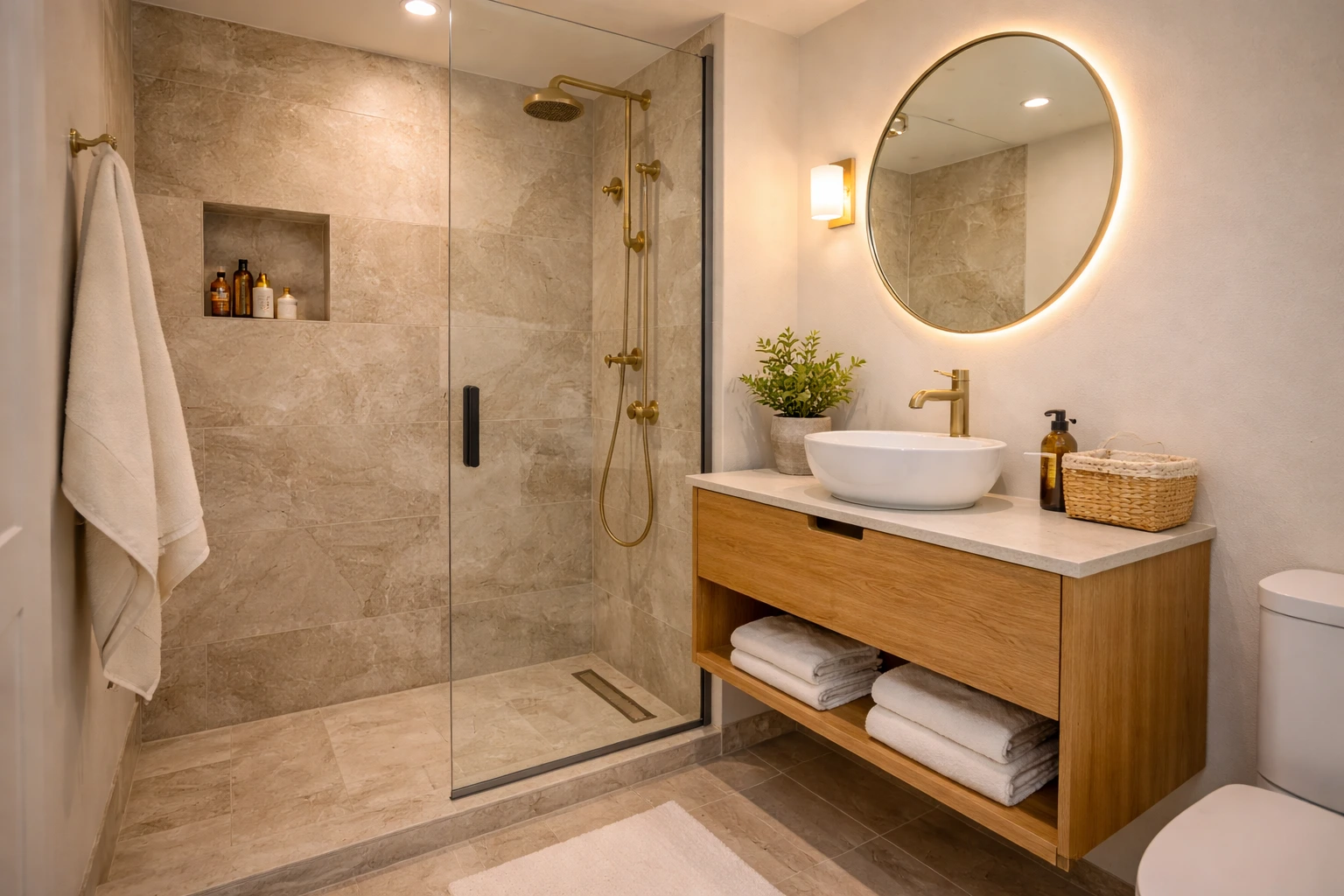 The bathroom might be the most surprising room of all. People tend to assume tiny bathrooms feel like an afterthought, but Ava treated hers like a design challenge worth getting exactly right. She chose a walk-in shower with a glass divider, which keeps the room visually open, and lined one wall with soft stone-look tiles that make the space feel more luxurious than its footprint suggests. A floating vanity, round mirror, and warm brass fittings add just enough character without overwhelming the room. There is even a narrow niche built into the shower wall for soaps and folded towels.