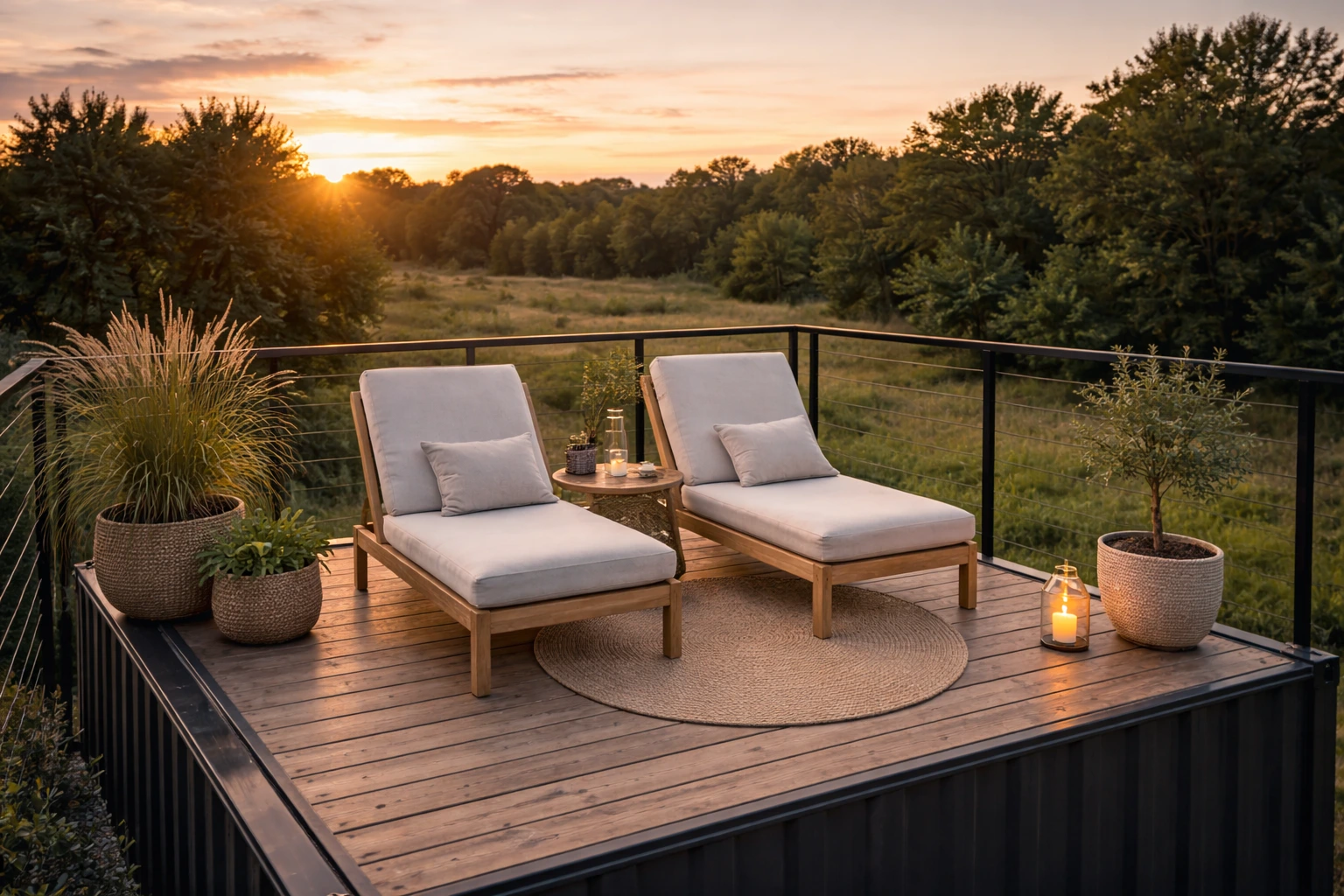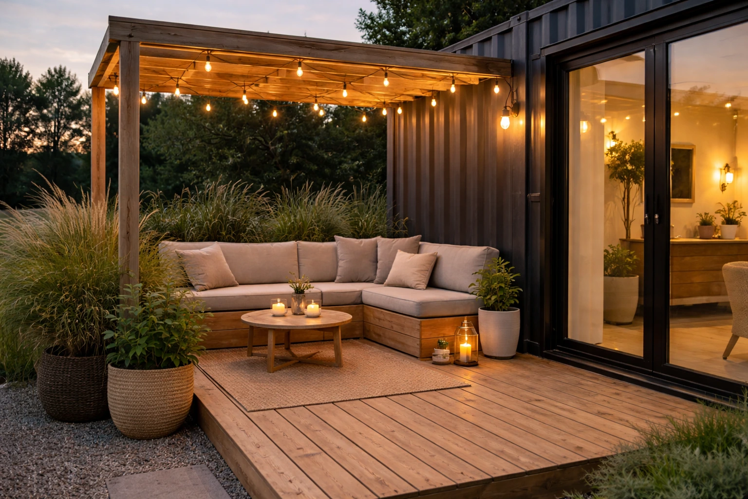 Outside, Ava made sure the home did not end at the metal walls. One side of the container opens onto a deck that works like an extra room for most of the year. There is a built-in bench, a small table for coffee, and enough space for her to sit with a book when the evenings are long and quiet. A simple pergola adds shade, and strings of warm lights turn the whole area into something magical after sunset. This was always part of her plan. If the indoor footprint had to stay small, the outdoors needed to feel just as livable and intentional.