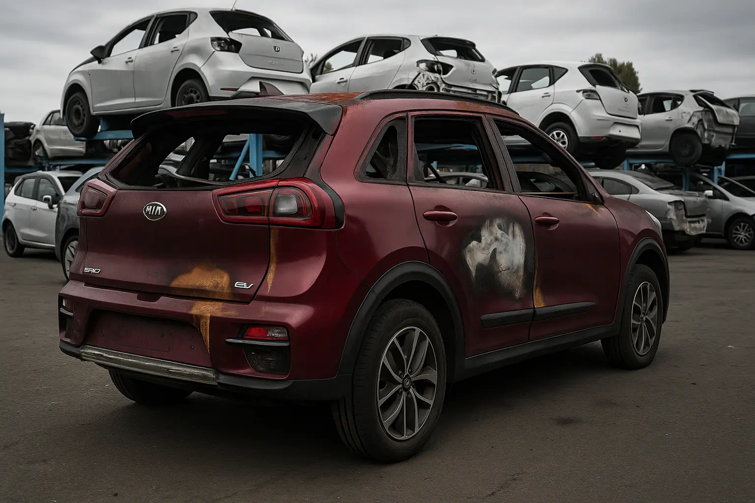 The explanation lay in the battery. The 64.8-kWh pack, mounted in the floor, remained intact. While the rear end had burned almost down to the bare chassis, the high-voltage system was still functioning perfectly. It was proof that EVs don’t necessarily succumb to fire easily — though this particular one was, of course, destined for dismantling.